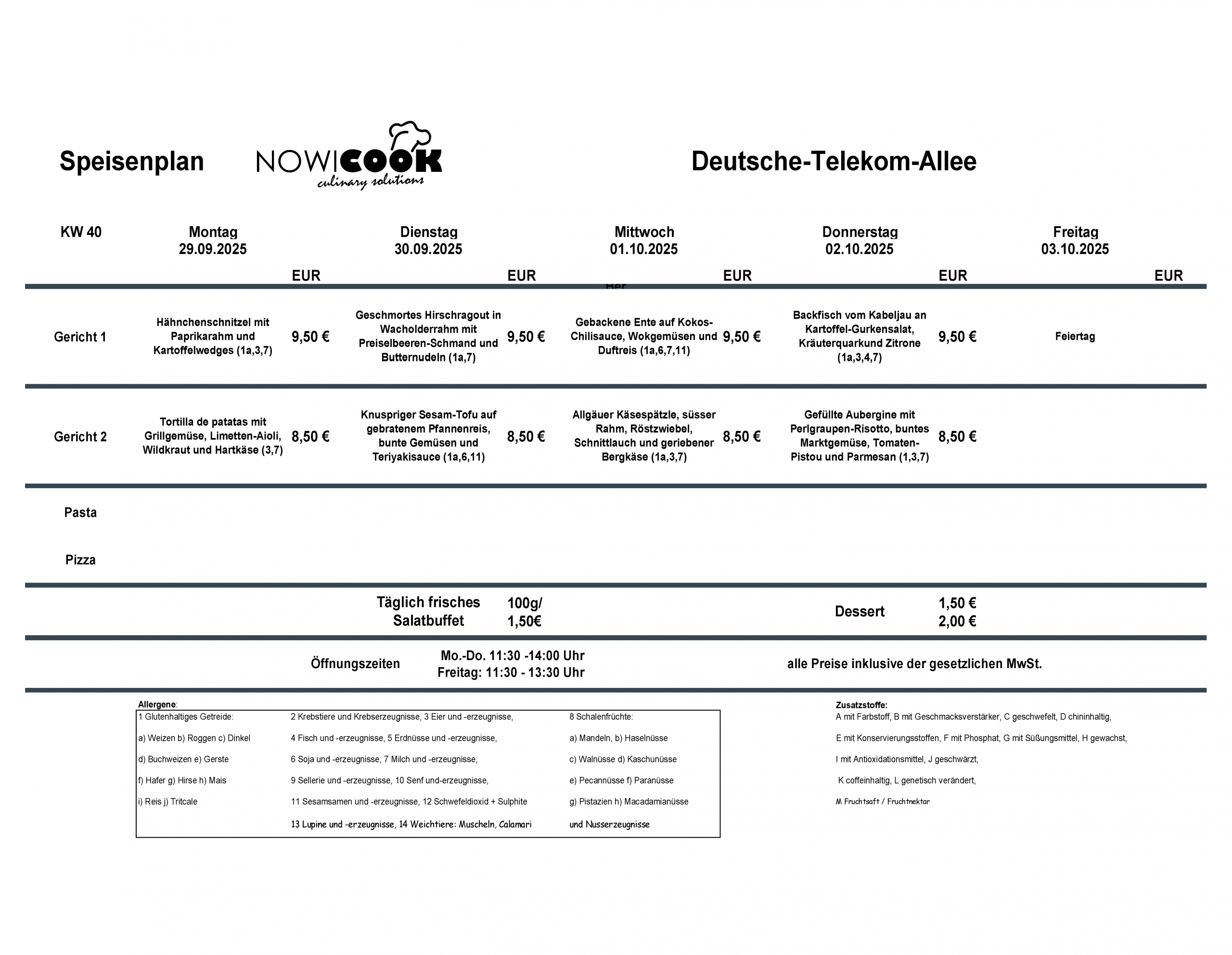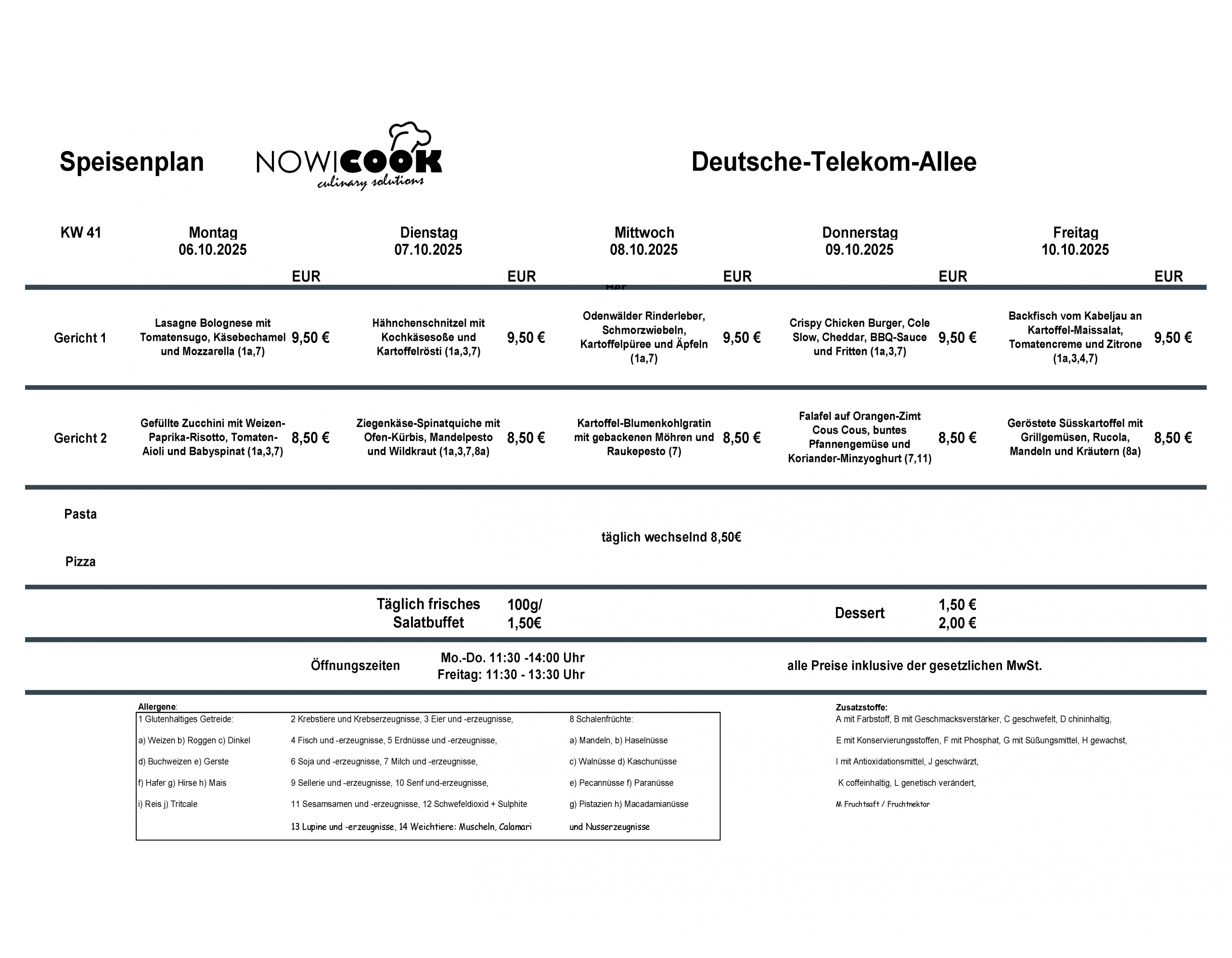 Von Montag bis Freitag begrüßen wir Sie herzlich zu unserem Mittagstisch in der Deutschen-Telekom-Allee 9, 64295 Darmstadt. Montags bis Donnerstags zwischen 11:30 und 14:00 Uhr, sowie Freitags von 11:30 bis 13:30 bieten wir Ihnen eine abwechslungsreiche Auswahl an frischen und leckeren Gerichten.